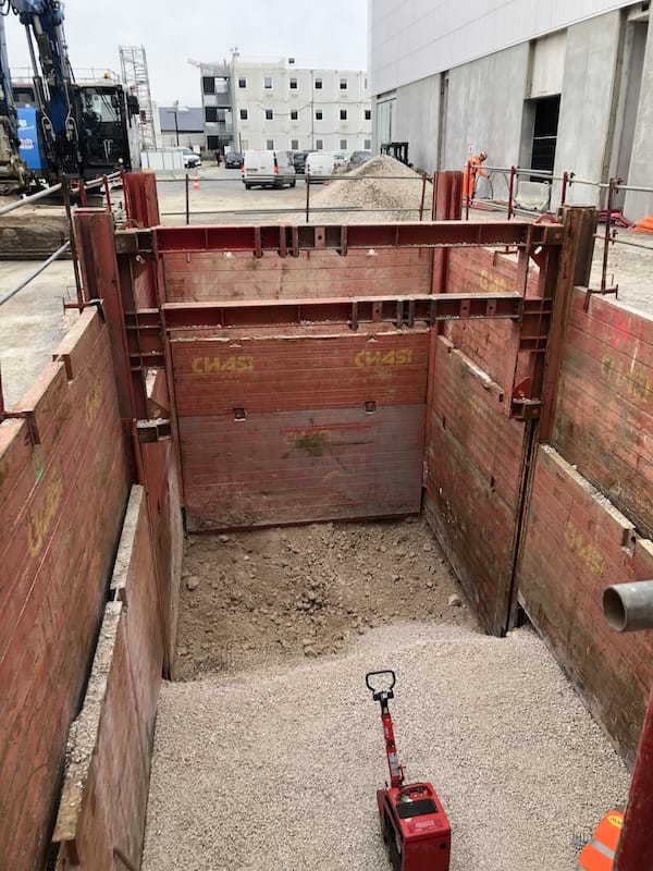 Le blindage coulissant linéaire double glissière constitue une solution robuste et polyvalente pour le blindage de tranchées ou de fosses (avec quatre côtés blindés grâce à l’utilisation de poteaux d’angle).