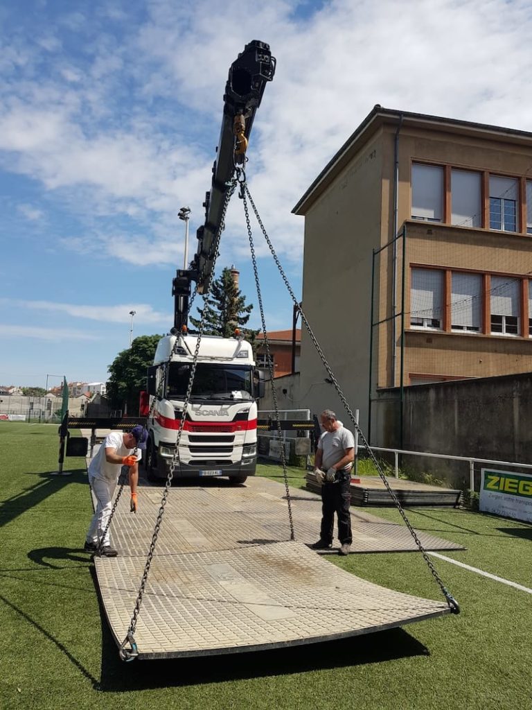 Nos équipes interviennent de A à Z : transport, mise en place précise des plaques de roulage et repli complet après l’événement